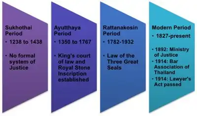 During the Ayutthaya Period (1351–1767 AD),[3] the first semblance of a legal system emerged. The law code was the Royal Stone Inscription[4] which was formulated from a set of rules derived from the Kings’ decisions[5] in the Court of Law.[Note 1] Although the law code[Note 2] allowed for people to be represented in court for civil and criminal matters, the lawyer's work was limited. He could not be involved in the examination of witnesses before the court and was mainly concerned with writing plaints and filing them before the court.[6]