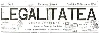 Legalitatea was a weekly newspaper published in Bârlad, Romania. The newspaper, covering political, economic and literary topics, was first printed on December 16, 1882, at the G.V. Munteanu printing shop. The last number of the newspaper was printed on January 1, 1884.