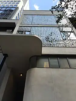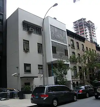 The Lescaze House was designed by William Lescaze in the International Style between 1933 and 1934.[3][6] The house is a redesign of an Italianate-style brownstone residence, constructed in 1865 by Elias and Daniel Herbert as part of a row of brownstone residences on the same block.[7] It is among New York City's few remaining structures designed by architects or artists as their own residences.[8] The house accommodated Lescaze's office at the bottom and his family's residence on the upper floors.[3]