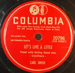 "Let's Live a Little" is a country music song written by Ruth E. Coletharp, recorded by Carl Smith, and released on the Columbia label. In June 1951, it reached No. 2 on the country charts.[1] It spent 20 weeks on the charts and was the No. 9 country record of 1951 based on juke box plays.[2][1]