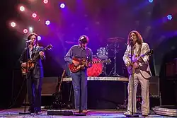 The show begins with the four actors portraying an early version of The Beatles' appearance at The Cavern Club in 1962. When this scene closes, The Beatles journey to America beginning their tour with their appearance on The Ed Sullivan Show is depicted. Moving forward, The Beatles' directions are changing musically while their band grows in popularity performing their largest concert at New York City's Shea Stadium.[3] Subsequent scenes use hallucinogenic[4] and psychedelic designs to further progress the representation of The Beatles' ever increasing experimentation with substances and eastern theory.[5] The show culminates with the breakup of the group in 1970.