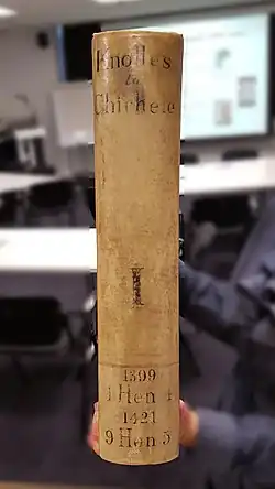 4. ^ The incident is recorded in the proceedings of the Court of Aldermen. The volume had fallen into the hands of an acquaintance of Robert Broke, the Common Serjeant of London, and on 1 July 1540, he was instructed by the Court to make an offer of 20 shillings for its surrender.[5]