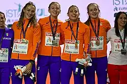The Dutch women's relay team with Cathelijn Peeters, Klaver, Femke Bol, and Lisanne de Witte after winning the 4 × 400 m relay final at the 2024 World Athletics Indoor Championships in Glasgow