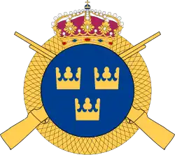 The coat of arms of the unit was used from 1977 to 2000. Blazon: "Azure, the lesser coat of arms of Sweden, three open crowns or placed two and one. The shield surmounted two muskets in saltire and is surrounded by a roundel of straw placed under muskets and crown, all or."[10]
