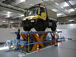 A lift table is a device that employs a scissors mechanism[1] to raise or lower goods and/or persons. Typically lift tables are used to raise large, heavy loads through relatively small distances. Common applications include pallet handling, vehicle loading and work positioning, as well as facilitating assembly operations, maintenance tasks, and product inspection. Lift tables are a recommended way to help reduce incidents of musculoskeletal disorders[2] by correctly re-positioning work at a suitable height for operators. Lift tables lend themselves to being easily adapted to a specific use. They can work in hostile environments, be manufactured in stainless steel and have equipment like conveyors, turn-tables, barriers and gates easily added to their deckplates.