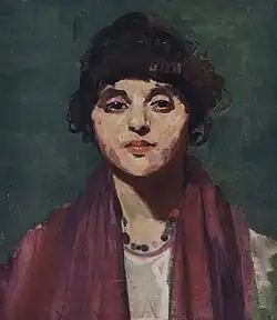 In 1911, Innes took Shelley to John's Welsh base at Penmachno. As far as is known, Innes did not paint Shelley, preferring landscapes, but he was such a poor figure painter that his subjects are not always identifiable. The fair-haired woman he did paint is most likely the model Euphemia Lamb.[8] However, Augustus John did paint Shelley in 1911,[10] showing her in a black dress, and the portrait was shown at the Alpine Club in 1917. She has been described as one of John's mistresses,[11] and he called her "Bill".[12] In 1934, Shelley recalled a long visit she had made to Spain with Augustus John.[11]