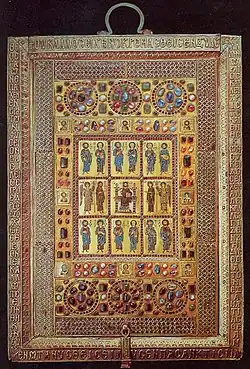The Limburg Staurotheke (from Greek σταυρός stauros, "cross" and θήκη theke "container") is an example of a Byzantine reliquary, one of the best surviving examples of Byzantine enamel, in the cloisonné technique. It was made sometime in the mid to late 10th century in Constantinople. The box measures 48 cm (19 in) by 38 cm (15 in) and has a depth of 6 cm (2.4 in). This reliquary design was common in Byzantium beginning in the 9th century.[1] It was probably brought to Germany as loot from the Fourth Crusade, and is now in the diocesan museum of Limburg an der Lahn in Hesse, Germany.