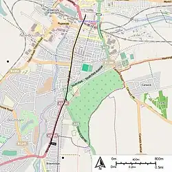 The tramway replaced the horse tram service previously provided by the Lincoln Tramways Company. The assets of this company were purchased by the Lincoln Corporation in July 1904 for the sum of £10,488[2] (equivalent to £1,427,300 in 2023).[3] It was a single route from Bracebridge, along Newark Road and High Street to Cornhill. The depot was on the corner of Newark Road and Ellison Street at SK 9688 6851. The depot building survives to this day.