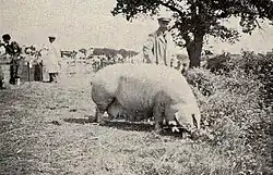 A Lincolnshire Curly-coated Pig Breeders' Association (with herd book) was started in 1906. By the 1930s, selective breeding had developed its fattening abilities, and large specimens were exported to Russia and other countries, including Hungary.[3][4] The breed, however, dwindled in the period after the Second World War, possibly partly due to changing farming patterns and a taste for leaner meat. The principal cause of the decline was the publication in 1955 of the Howitt report, which found breed diversity to be a handicap to the pig industry in Britain, and established a policy of concentrating production on three breeds only: the Welsh, the British Landrace and the Large White.[5] Of the sixteen British pig breeds, four – the Cumberland, the Dorset Gold Tip, the Lincolnshire Curly Coat and the Yorkshire Blue and White – became extinct.[6] The Lincolnshire Curly Coat was the last of these to disappear; a survey conducted in 1970 by the University of Reading found none.[2]: 565