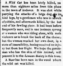 Item in the Boston Weekly Messenger, 1817, on a recently killed wildcat, suitable for donation to the Linnaean Society
