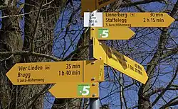 The forested region is accessible via an array of forest roads. Numerous hiking trails lead over the mountain, including the Jura-Höhenweg long-distance hiking route, which extends from the renowned natural landmark Linner Linde to the ridge, offering a panoramic view from a natural vantage point high above the Längibachtal valley.[13] This vista encompasses the Aare Valley and the majestic Alps. While the official hiking route bypasses the highest summits, these peaks can be accessed via forest trails. The "Linnerberg Trail," designated for mountain biking, is marked along the ridge.[14] The eastern slope of the Linnerberg is recognized as a challenging area for orienteering activities.[15]