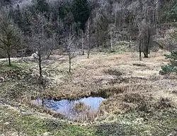 The mountainous terrain safeguards diverse reptile habitats, including the elusive asps viper, a species rarely found within the canton of Aargau.[17] On the northern slope of the Grund mountain range, a wetland has been established within a section of the former "Eriwis" opalinuston pit near Schinznach train station. This area, once exploited by Zurich Brickworks (Zürcher Ziegeleien) until 1998, holds the distinction of being one of the nationally significant amphibian spawning grounds.[18] Designated as a cantonal nature reserve in 2021, this 15-hectare site has been under the stewardship of BirdLife Aargau and the Eriwis Nature Workshop since 2015, with the latter managing the area since 2006.[19][20] The reserve and its surroundings have many types of birds, various amphibians like grass frogs, midwife toads, and common toads, and around 25 types of dragonflies. A comprehensive study by ETH Zurich has documented around 100 wild bee species within the reserve and its immediate vicinity.[21][22][23] Furthermore, diverse orchid species thrive within the dry meadow segments of Eriwis.