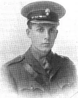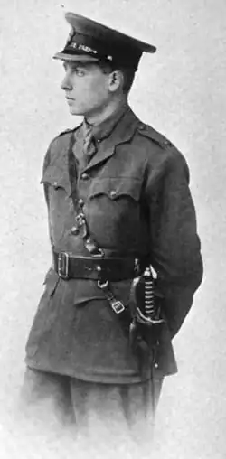 Harvard planned to become a medical missionary, but on returning to London immediately after graduation he enlisted in the British Army.[5]: 14  "It is all of a piece with the devotion which the best young men of Europe are rendering to their flags," said the Harvard Alumni Bulletin.[26] He joined the Inns of Court Officers' Training Corps on 12 July 1915[27] and was commissioned a second lieutenant in the Grenadier Guards on 28 September.[28] He was promoted to lieutenant in January 1916[29] and joined the 1st Battalion in France on 8 March 1916.[30]