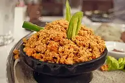 Kitfo Ethiopia and Eritrea Raw beef marinated in mitmita (a chili powder based spice blend) and niter kibbeh.