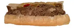 Nationwide; origins in Philadelphia | Made with thinly sliced pieces of beefsteak mixed with cheese on a hoagie roll, with additional toppings often including peppers, onions, and mushrooms |