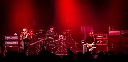 Upon receiving an offer to tour in Greece, Blue Öyster Cult reformed in 1987 with returning keyboardist Lanier and new drummer Ron Riddle.[8][9] The band's next studio album, Imaginos, was originally recorded as an Albert Bouchard solo album, but was later reworked and released by the band.[8] Riddle left in May 1991 and was replaced the following month by Chuck Burgi.[9][10] John Miceli briefly substituted for Burgi in May 1992,[11] and in September 1995 the drummer left the band to join Rainbow.[10] Rogers also left in April, with Greg Smith taking his place until Danny Miranda took over in August.[12][13] John O'Reilly joined on drums in September, but would only remain until the following August when Burgi returned.[14][10] Miceli returned for a string of shows in early 1997, before Bobby Rondinelli joined in February.[15] Guitarist Al Pitrelli toured with the band as a substitute for Lanier from February to March during the band's 1999 tour.[16]