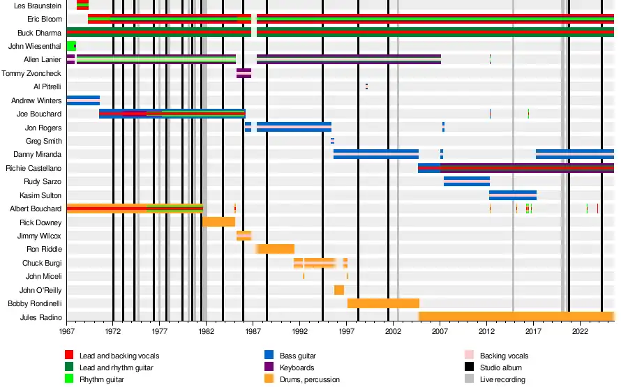 Blue Öyster Cult was formed in 1967 as Soft White Underbelly, under the guidance of manager Sandy Pearlman and writer Richard Meltzer.[1] The original lineup of the group included guitarist and vocalist Donald "Buck Dharma" Roeser, keyboardist Allen Lanier, rhythm guitarist John Wiesenthal, bassist and backing vocalist Andrew Winters, and drummer and backing vocalist Albert Bouchard.[1] After several short-lived line-ups, Les Braunstein was brought in later as the band's first lead vocalist.[1] Braunstein was replaced by Eric Bloom in mid-1969, during which time the band changed name twice – first to Oaxaca and later to Stalk-Forrest Group.[1] Winters was replaced in the summer of 1970 by Albert's brother Joe Bouchard,[2] and the following year the group settled on the name Blue Öyster Cult.[1]