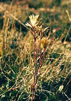 This is a list of the species in the genus Castilleja. They are commonly called paintbrushes,[1] painted-cups, or owl’s-clovers in English.[2] These 218 species and two natural hybrids are considered valid by Plants of the World Online (POWO) as of 2024.[3] This list largely agrees with World Flora Online (WFO) with some exceptions. WFO lists Castilleja eggeri as unchecked.[4] It also spells some species names differently, Castilleja rhexiifolia with a single "i" instead of a double "ii", Castilleja tolucensis as Castilleja toluccensis, and Castilleja virgatoides as Castilleja virgayoides.[5][3] In addition one of the two hybrids, Castilleja × cognata, is listed in WFO as a species rather than as a hybrid.[6]