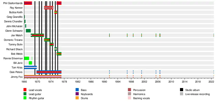 James Gang was formed in 1966 by Phil Giallombardo, Ronnie Silverman, Tom Kriss and Jimmy Fox, who worked with a succession of lead guitarists. Before the end of 1966, Glenn Schwartz had taken over lead guitar duties.[1] The next summer, Silverman left to join the army and was replaced in the group by Bill Jeric.[2] At the end of 1967, Schwartz left to relocate to Los Angeles, California where he formed Pacific Gas & Electric.[3] Schwartz was replaced in the new year by Joe Walsh.[4] On the eve of a show supporting Cream in June, Silverman left and the group became a trio, with Walsh taking over on lead vocals.[5]