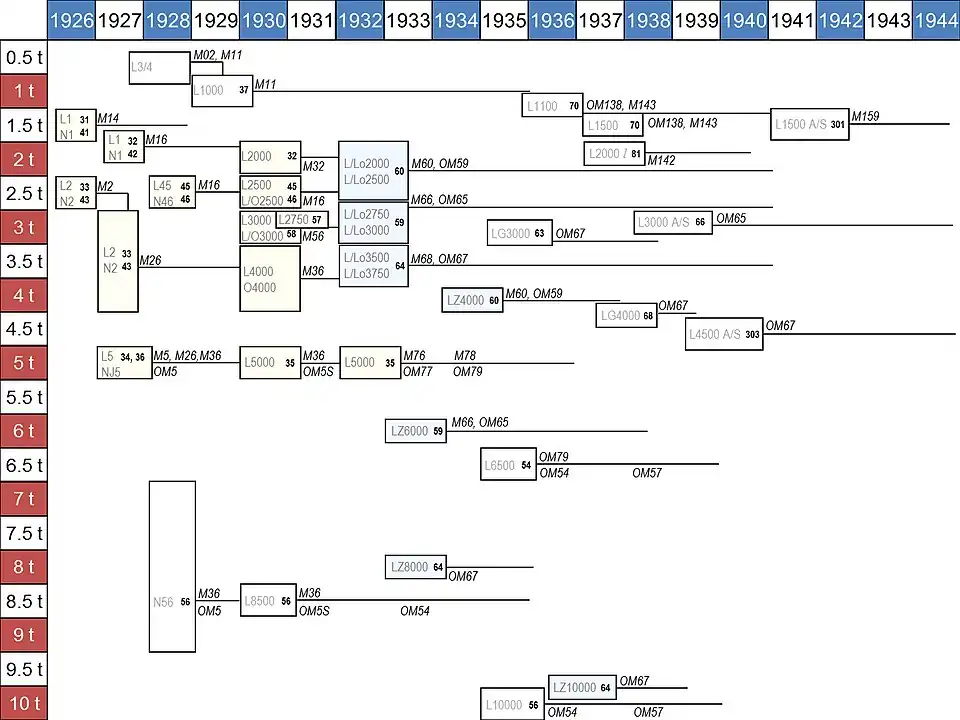 The chart of Mercedes-Benz truck models (including the internal designations), 1926–1944. Horizontally: years of production Vertically: payload in tons (approximately) Yellow boxes: L1/L2/L5 family, Light-blue boxes: Lo2000 family, White boxes: the rest.