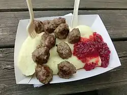 - Kjøttbolle – smaller rounder meatballs, often served with brun saus, mashed potatoes and lingonberry jam.[48]