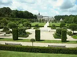 The present château and gardens in the French style were created in the 18th century, and restored in the 20th century. Parts of château date to the 16th century. The principal feature of the garden is a grand avenue from the gate to the château lined by yew trees shaped into cones, alternating with statues and vases. There are two secondary avenues of double rows of linden trees. The gardens also feature a large rectangle of chestnut trees providing shade, and avenues of hornbeam hedges 350 metres long on the west and south.
