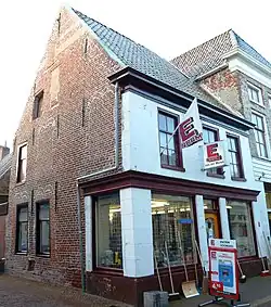 | Building under transverse gable roof with narrow carved consoles to the fascia | possibly Middle ages (core) | Gouden Pand 5 | 53°19′16″N 6°51′23″E / 53.32122°N 6.85626°E | 8215 | ![]() | ||