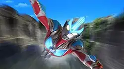 Ultraman Gingavictory (ウルトラマンギンガビクトリー, Urutoraman Gingabikutorī) is the fusion initiated by both Ultramen Ginga and Victory. It was made when Hikaru and Sho performed the Ultra Touch (ウルトラタッチ, Urutora Tatchi), and scans the Ultra Fusion Brace (ウルトラフュージョンブレス, Urutora Fyūjon Buresu) to the Victory Lancer. It was first shown during the Ultraman Ginga S: Showdown! Ultra 10 Warriors!!, which made after Hikaru and Sho were trained by Ultraman Zero to cooperate. Gingavictory first defeated a gigantic copy of Dark Lugiel and joined the other Ultra Warriors in fighting Etelgar. After Cosmos rescued Arina, Gingavictory launched an all-out attack on Etelgar and pursued him to space before defeating him for good. It was accessed again in Ultra Fight Victory to fight against Yapool, although the latter managed to revive Juda in his dying breath. However, the fusion did not last longer when Super Grand King Spectre attacked them, forcing him to split.