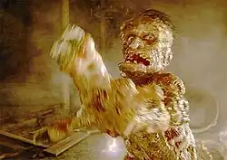 Vincent Hammond portrayed Grendel in Graham Baker's film Beowulf (1999). Among the artistic liberties taken in this version set in a post-apocalyptic future, Grendel is depicted as an armored creature with jagged fangs and clawed hands and feet, and he's stated to be the son of Hrothgar and he is shown to be capable of rendering himself partially invisible in a Predator-like manner. His manner of death also differs from the original source. As with the poem, Beowulf tears off Grendel's arm during their first battle, though Grendel survives the wound in the film. Beowulf kills Grendel later on by stabbing his stump.[1]