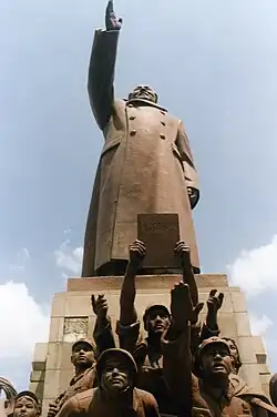 Thomas Sankara during his regime from 1983 to 1987 tried to prevent cults of personality, including hanging posters of him, claiming that there all already "seven million Sankaras".[25] Nevertheless, after his assassination, a posthumous cult of him arose in Burkina Faso arose after the 2022 Burkinabe military coup; a street in the capital Ouagadougou originally named after Charles De Gaulle for example was renamed after Sankara, and his body was exhumed into a mausoleum in 2025[26][27]