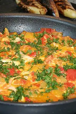 Shakshouka Savory Middle East Poached eggs cooked in tomato and paprika sauce, seasoned with harisa, cumin and salt. Might be served with cheese.
