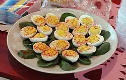 Deviled eggs Savory England Spain Yolks of hard-boiled eggs are mashed with cream or mayonnaise, mustard, and seasonings and then mounded or piped into the white of the boiled egg. Served cold, often al fresco.