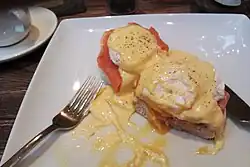 Eggs Benedict Savory United States Poached eggs on Canadian bacon on top of toasted English muffin halves covered with hollandaise sauce.