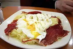 Huevos rotos Savory Spain Fried or scrambled eggs are served on top of fried potatoes, sometimes with ham or other types of meat such as chorizo. If the eggs are fried, they may be put whole on top of the potatoes or they may be cut up.