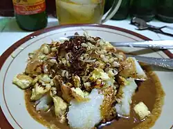 Tahu Telur[59][60] Savory Indonesia A dish consisting of half-cooked fried tofu and fried egg served with rice cake, some bean sprouts, and doused with shrimp paste and peanut sauce seasoning, topped with a sprinkling of crackers.
