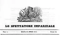 Lo Spettatore Imparziale monthly Italian 23 April 1838 pre-1899[5] Pro-British; edited by Canon Fortunato[4]: 11  (or Francesco) Panzavecchia[6]