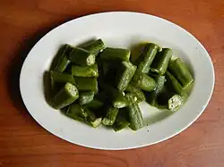 Fried okra Okra pods that have been sliced and dredged in cornmeal before frying.