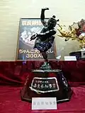 Nara Prefectural Governor's Award | The trophy is a bronze statue of a sumo wrestler. It was created based on the mosaic wall painting of the former National Stadium of Nara-city. The pedestal is decorated with a Nara traditional lacquerware craft and with patterns inspired by the Shōsōin treasures. It is 84 cm (2 ft 9 in) high, 5 cm (2 in) wide and weighs 15 kg (33 lb).[37] | Nara Prefecture | 2014