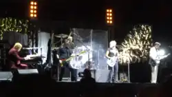 In February 1983, the Pretenders returned with McIntosh and bassist Malcolm Foster.[7] Learning to Crawl was released in 1984, after which the band remained largely inactive for a year (save for an appearance at Live Aid) as Hynde married Simple Minds frontman Jim Kerr and gave birth to daughter Yasmin.[8] The group returned in early 1986 to record Get Close, but shortly after sessions began Chambers was fired by Hynde due to a deterioration in his drumming ability, which also led to Foster leaving.[9] Chambers and Foster were replaced by Blair Cunningham and T. M. Stevens, respectively, who completed the album's recording and remained for its 1987 tour (keyboardist Bernie Worrell also joined at the same time).[10] Shortly after beginning the tour, however, Hynde dismissed Stevens and Worrell and brought back Rupert Black (who had toured since Learning to Crawl) and Foster, who remained for the rest of the year.[11] Johnny Marr replaced McIntosh in late 1987,[12] before the band went on hiatus.[10]