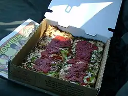 Detroit-style pizza Detroit, Michigan A style of pizza developed in Detroit, Michigan. It is a square pizza similar to Sicilian-style pizza that has a thick deep-dish crisp crust and toppings such as pepperoni and olives and is served with the marinara sauce on top.[7][8] The crust of a Detroit-style pizza is noteworthy because in addition to occasionally being twice-baked, it is usually baked in a well-oiled pan to a chewy medium-well-done state that gives the bottom and edges of the crust a fried/crunchy texture.