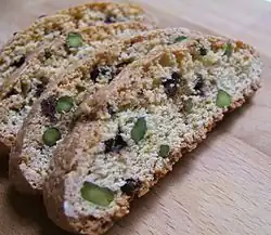Biscotti Prato, Italy More accurately known as biscotti di Prato (Prato biscuits), also known as cantuccini (coffee bread), are twice-baked biscuits originating in the Italian city of Prato. The biscuits are oblong-shaped almond biscuits, made dry and crunchy through cutting the loaf of dough while still hot and fresh from baking in the oven. Pictured is chocolate and pistachio biscotti.