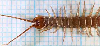 Lithobius forficatus, most commonly known as the garden centipede, brown centipede or stone centipede, is a common centipede of the family Lithobiidae.