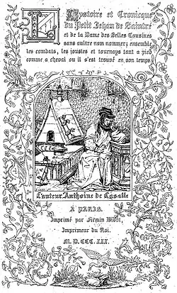 Little John of Saintré (French: Le Petit Jehan de Saintré), full title L'Hystoire et plaisante cronicque du petit Jehan de Saintré et de la jeune dame des Belles-Cousines sans aultre nom nommer, is a 1456 novel or romance written by Antoine de la Salle. It was the author's most successful work, written when he was nearly 70 years of age.[1] He dedicated to it his former pupil, Jean de Calibre. An envoi in manuscript 10,057 (nouv. acq. fr.) in the Bibliothèque Nationale, Paris, states that it was completed at Grand Châtelet on 6 March 1455 (i.e. 1456).[1]