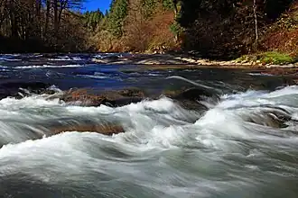 Gerlinger County Park is on the right at RM 15 (RK 24). Dutch Creek enters from the left and Berry Creek from the right before the river reaches Falls City Falls and Falls City about 13 miles (21 km) from the mouth.[4][6] At the falls, the river plunges 25 to 35 feet (7.6 to 10.7 m) into a gorge within a city park.[7] Turning southeast, the river receives Waymire Creek from the left, then Teal Creek from the right, then passes under Oregon Route 223 at about RM 8 (RK 13). Fern Creek enters from the left just beyond Route 223, and Cooper Creek enters from the left about 1.5 miles (2.4 km) from the mouth. The Little Luckiamute River meets the Luckiamute River about 18 miles (29 km) from the larger river's confluence with the Willamette River.[4][6]