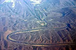 Oblique air photo of the meandering Potomac River at Little Orleans (center), facing north. The photo shows Allegany County, Maryland (left), Morgan County, West Virginia (right), Sideling Hill (right), and the Chesapeake and Ohio Canal.