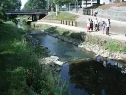 Running through some of Charlotte's oldest neighborhoods, over time parts of Little Sugar Creek became hidden by houses, factories, parking lots, riprap, highways, and culverts.[7] The stream also became very polluted by runoff from factories and sewers, and litter.[8]