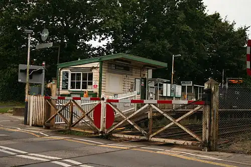 There is a level crossing at the eastern (London) end of the platforms, where the line crosses Rusper Road. The crossing gates were considered for replacement with modern barriers in the early 1990s but as there was a history of late passengers running over the crossing to catch their train it was dismissed. Therefore, the adjacent signal box was staffed 24 hours a day. In October 2012 the level crossing was rebuilt and automatic barriers installed to replace the old fashioned gates. This meant that the crossing operator's job was now redundant, with CCTV used to control the crossing from the Three Bridges signal centre.[3] This upgrade was finally made necessary due to a number of incidents of people driving through the wooden gates when closed, resulting in expensive replacement gates having to be constructed.[4][5]