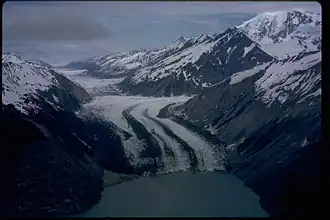 Lituya Glacier is a tidewater glacier in the U.S. state of Alaska. Located at 58°43′25″N 137°29′33″W / 58.72361°N 137.49250°W inside Glacier Bay National Park and Preserve, its source is in the Fairweather Range and it feeds into Lituya Bay on the gulf coast of Southeast Alaska.