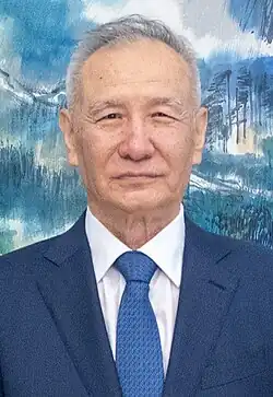 Liu He (Chinese: 刘鹤; pinyin: Liú Hè; born 25 January 1952) is a Chinese economist and retired politician who served as a vice premier of China from 2018 to 2023. Additionally, he served as the director of the Office of the Central Financial and Economic Affairs Commission of the Chinese Communist Party (CCP) from 2013 to 2023, the director of the Financial Stability and Development Committee from 2017 to 2023, as well as a member of the Politburo of the Chinese Communist Party from 2017 to 2022.