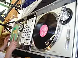 The packaging features a disc jockey motif, including imagery such as a DJ turntable like the one pictured.